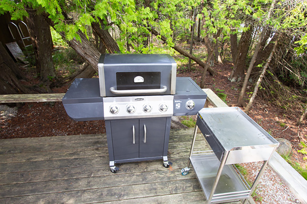 Outdoor Features: Step outside to discover a spacious deck with comfortable seating options and propane BBQ and fire pit, perfect for lounging lakeside or with views of the woods.